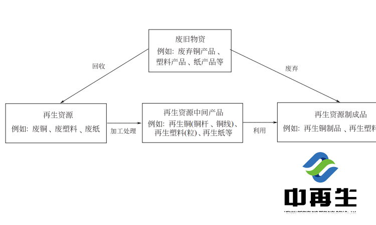 再生資源是指來源于社會生產(chǎn)和生活消費過程的各類廢棄物,經(jīng)過回收、加工和利用等環(huán)節(jié),可以重新獲得使用價值的物質(zhì)。此外,對符合國家環(huán)??刂茦?biāo)準(zhǔn)的進口可用作原料的固體廢物也是中國再生資源的一個重要來源。需要注意的是,再生資源與再生資源產(chǎn)品的概念有區(qū)別。例如再生銅、再生鋁、再生塑料等概念是指廢舊銅、鋁和塑料經(jīng)過回收、分揀、熔煉、拉絲造粒等環(huán)節(jié)加工而成的中間再生資源產(chǎn)品,為制造企業(yè)深加工得到再生資源的制成品提供原料,如圖所示: